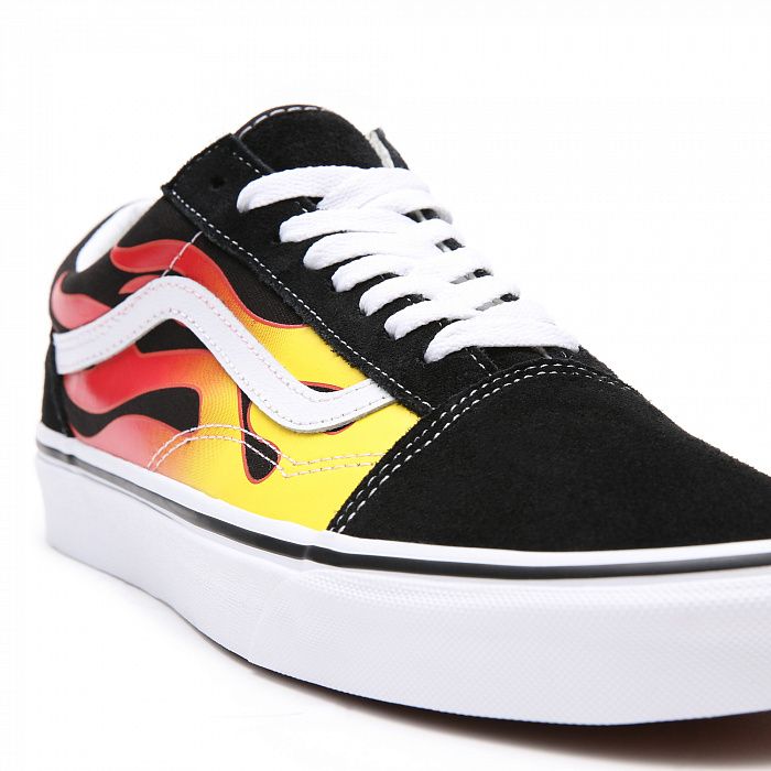 Кеды Old Skool Flame с огненным принтом на черном фоне отдают дань уважения нашему наследию и остаются классикой на все времена. Модель имеет прочный верх из замши и канваса, усиленный мысок, мягкую окантовку и фирменную вафельную подошву из резины.